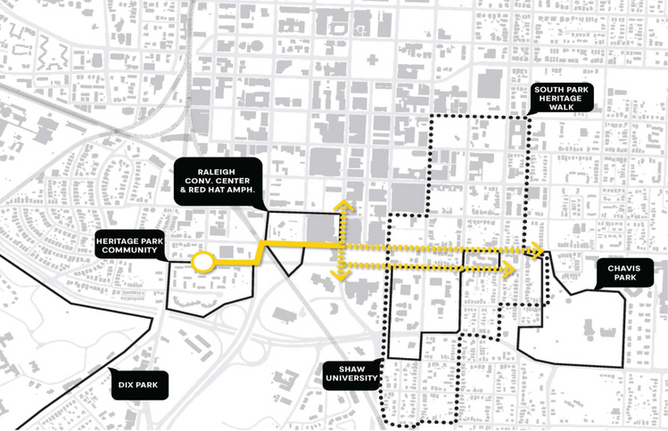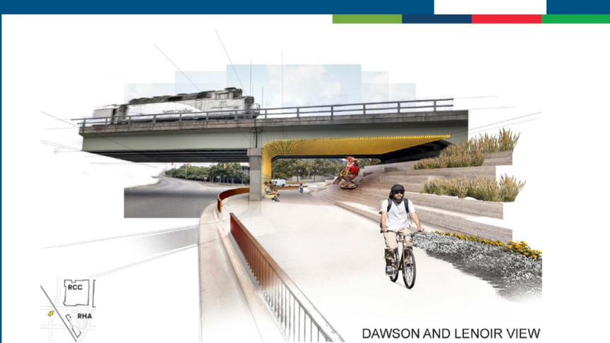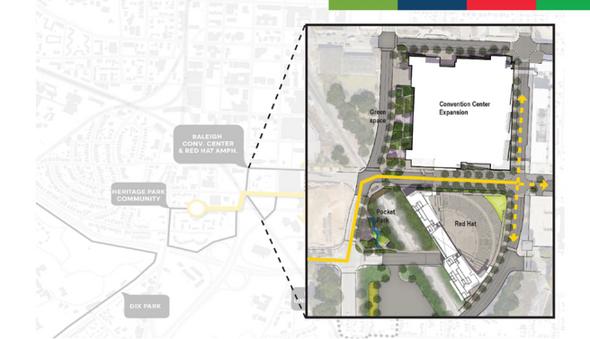 In short, plans for the Convention Center expansion and Amphitheater relocation include funds to keep vehicle traffic flowing along Lenoir St. while adding a 14 ft. wide walkway with bike and pedestrian lanes along the Lenoir St-McDowell St–Dawson St edges of the new venue. The wide walkway could be knit into the future route of the Chavis-Dix Strollway. At present, the final route of the Strollway has not been determined.