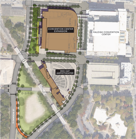 Now that expansion process is underway. At issue is the potential closure of South St. between Dawson St. and McDowell St., which is necessary for the new amphitheater’s footprint. Initial plans released in February 2023 intended to close a block of Lenoir St., however the plan shifted the proposed closure to South St. because moving existing infrastructure and utilities along Lenoir St. would make the project cost prohibitive.